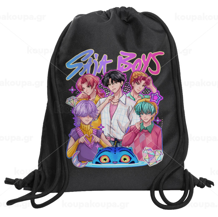 Huntrix Saja Boys, Τσάντα πλάτης πουγκί GYMBAG Μαύρη, με τσέπη (40x48cm) & χονδρά κορδόνια