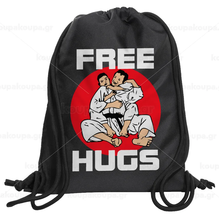 JUDO free hugs, Τσάντα πλάτης πουγκί GYMBAG Μαύρη, με τσέπη (40x48cm) & χονδρά κορδόνια