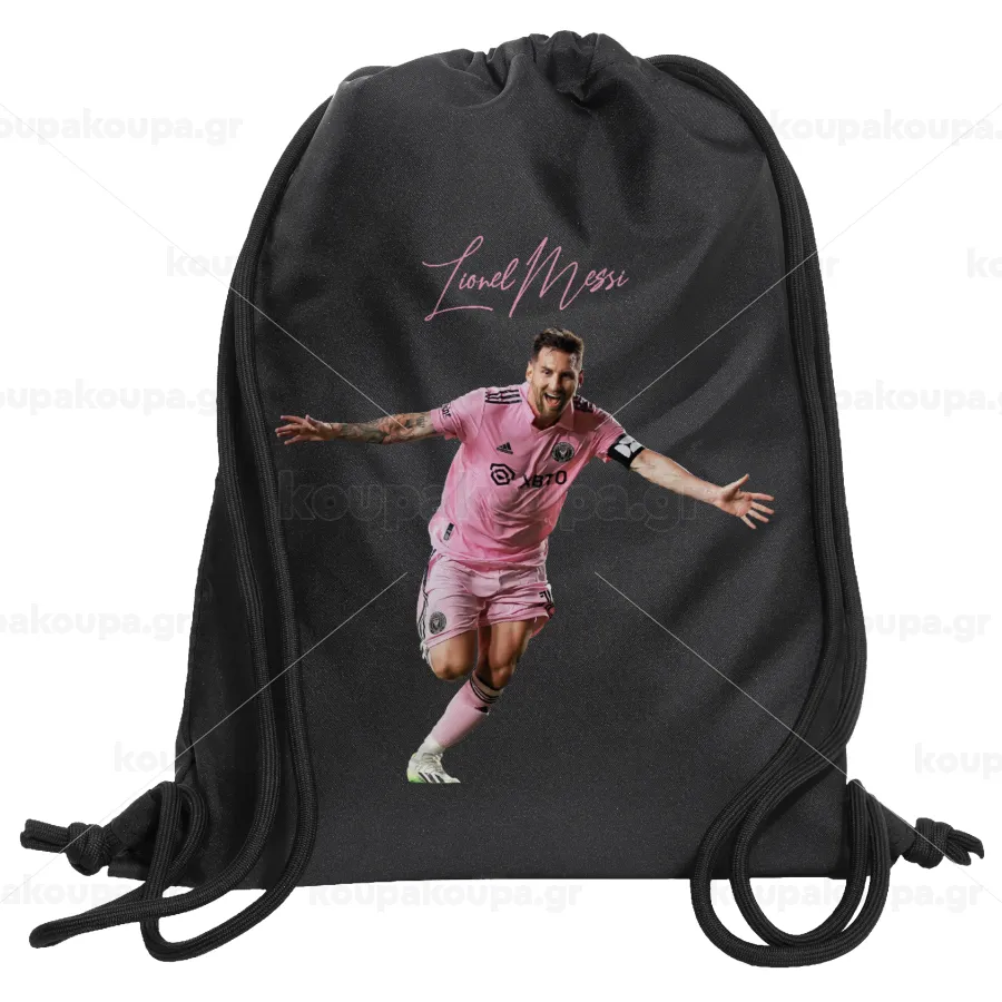 Lionel Messi inter miami jersey, Τσάντα πλάτης πουγκί GYMBAG Μαύρη, με τσέπη (40x48cm) & χονδρά κορδόνια