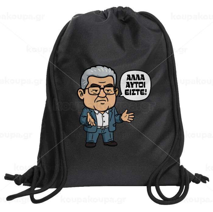 Κουτσούμπας, "Αλλά αυτοί είστε!", Τσάντα πλάτης πουγκί GYMBAG Μαύρη, με τσέπη (40x48cm) & χονδρά κορδόνια
