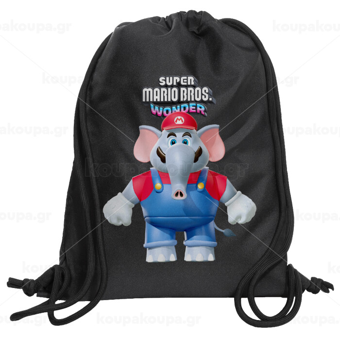 Super mario wonder, Τσάντα πλάτης πουγκί GYMBAG Μαύρη, με τσέπη (40x48cm) & χονδρά κορδόνια