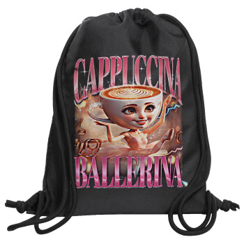 BALLERINA CAPUCHINA FUNK, Τσάντα πλάτης πουγκί GYMBAG Μαύρη, με τσέπη (40x48cm) & χονδρά κορδόνια