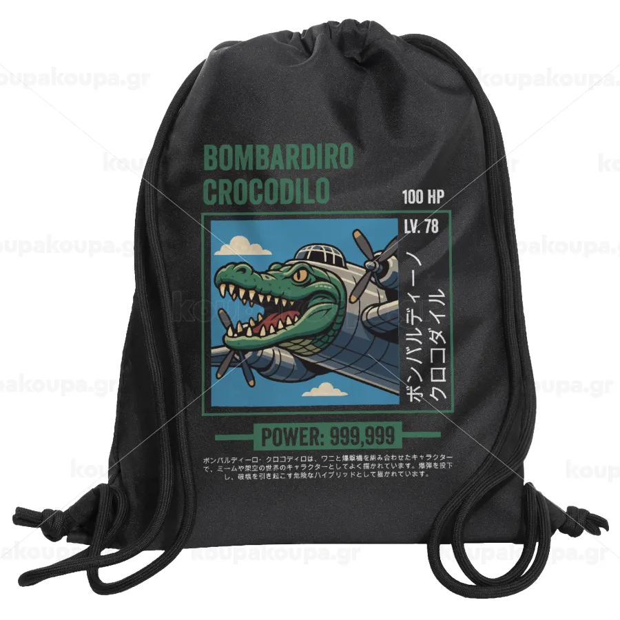 Bombardiro Crocodilo, Τσάντα πλάτης πουγκί GYMBAG Μαύρη, με τσέπη (40x48cm) & χονδρά κορδόνια