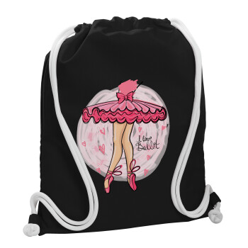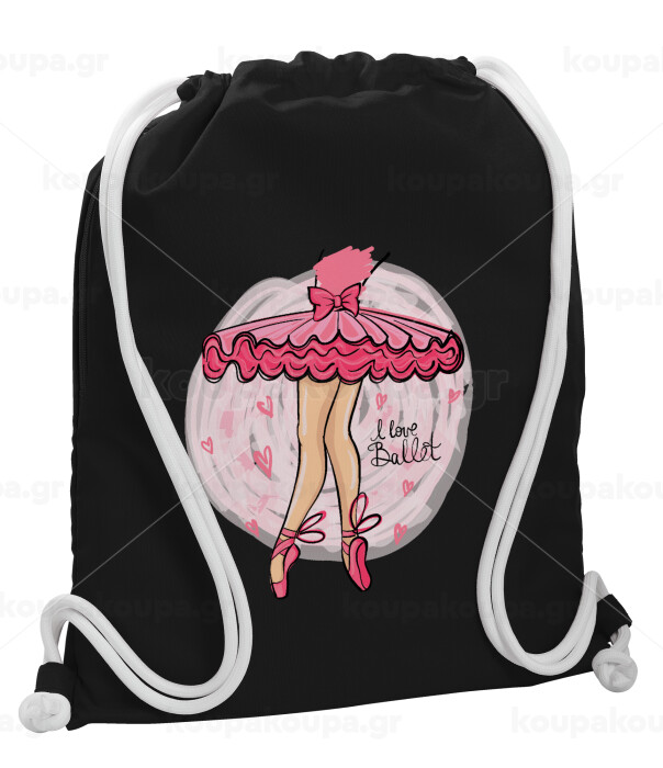 I Love Ballet, Τσάντα πλάτης πουγκί GYMBAG Μαύρη, με τσέπη (40x48cm) & χονδρά λευκά κορδόνια