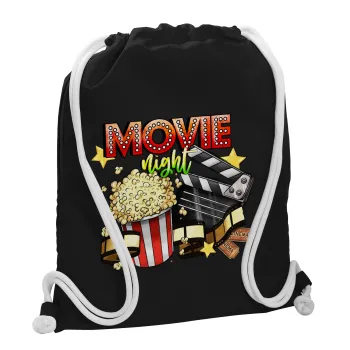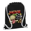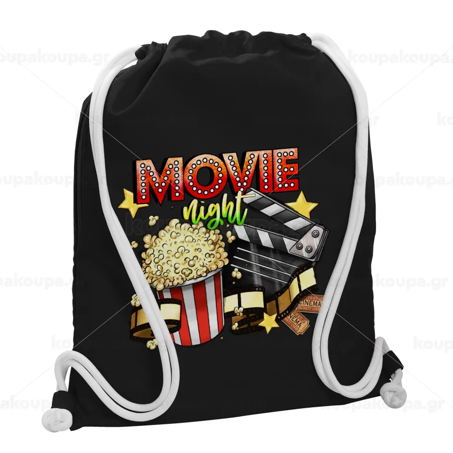 Movie night, Τσάντα πλάτης πουγκί GYMBAG Μαύρη, με τσέπη (40x48cm) & χονδρά λευκά κορδόνια