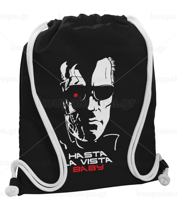 Terminator Hasta La Vista, Τσάντα πλάτης πουγκί GYMBAG Μαύρη, με τσέπη (40x48cm) & χονδρά λευκά κορδόνια