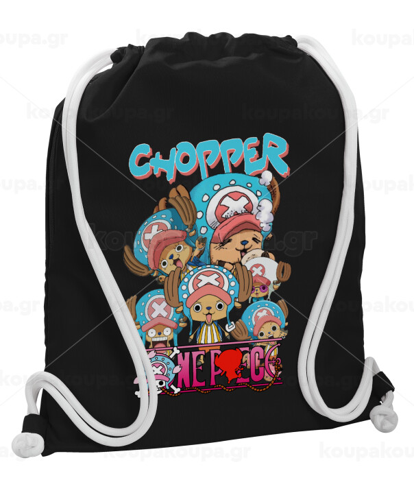 Chopper One Piece, Τσάντα πλάτης πουγκί GYMBAG Μαύρη, με τσέπη (40x48cm) & χονδρά λευκά κορδόνια