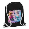 Έλσα & Άννα, Τσάντα πλάτης πουγκί GYMBAG Μαύρη, με τσέπη (40x48cm) & χονδρά λευκά κορδόνια