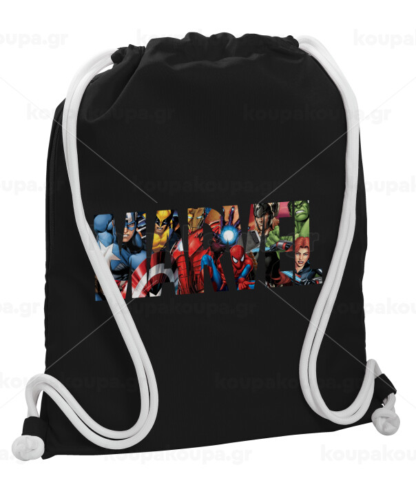 MARVEL characters, Τσάντα πλάτης πουγκί GYMBAG Μαύρη, με τσέπη (40x48cm) & χονδρά λευκά κορδόνια