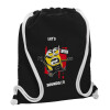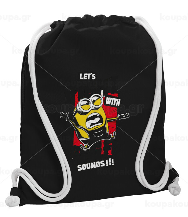 Minions Let's fight with kung fu sounds, Τσάντα πλάτης πουγκί GYMBAG Μαύρη, με τσέπη (40x48cm) & χονδρά λευκά κορδόνια