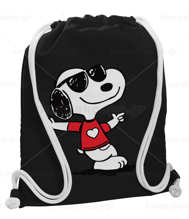 Snoopy καρδούλα, Τσάντα πλάτης πουγκί GYMBAG Μαύρη, με τσέπη (40x48cm) & χονδρά λευκά κορδόνια