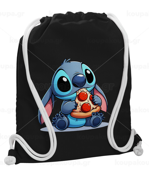 Stitch Pizza, Τσάντα πλάτης πουγκί GYMBAG Μαύρη, με τσέπη (40x48cm) & χονδρά λευκά κορδόνια