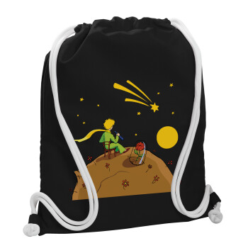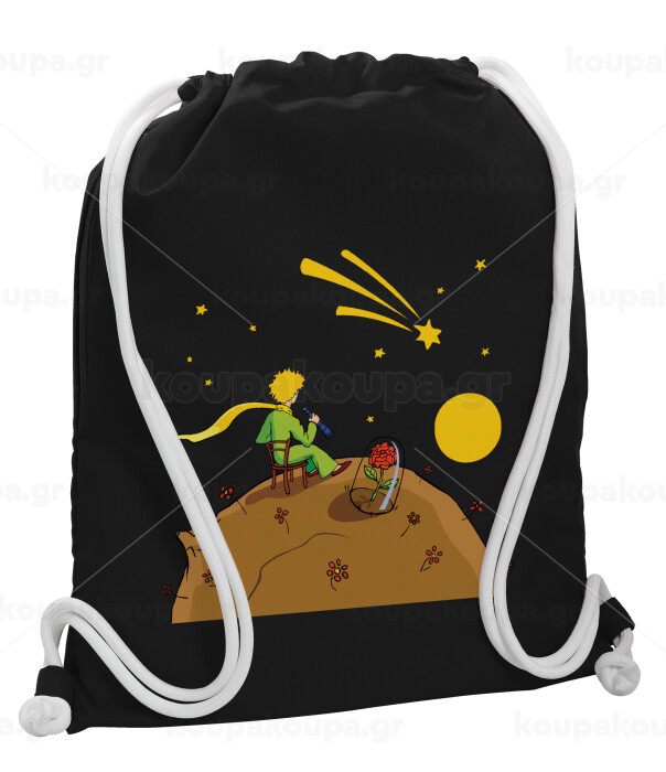 Ο μικρός πρίγκιπας planet, Τσάντα πλάτης πουγκί GYMBAG Μαύρη, με τσέπη (40x48cm) & χονδρά λευκά κορδόνια