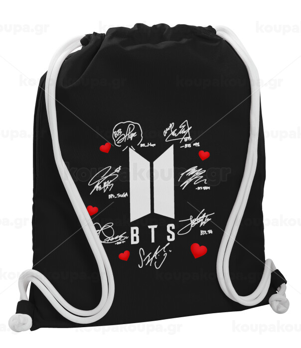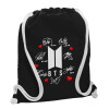 BTS signs, Τσάντα πλάτης πουγκί GYMBAG Μαύρη, με τσέπη (40x48cm) & χονδρά λευκά κορδόνια