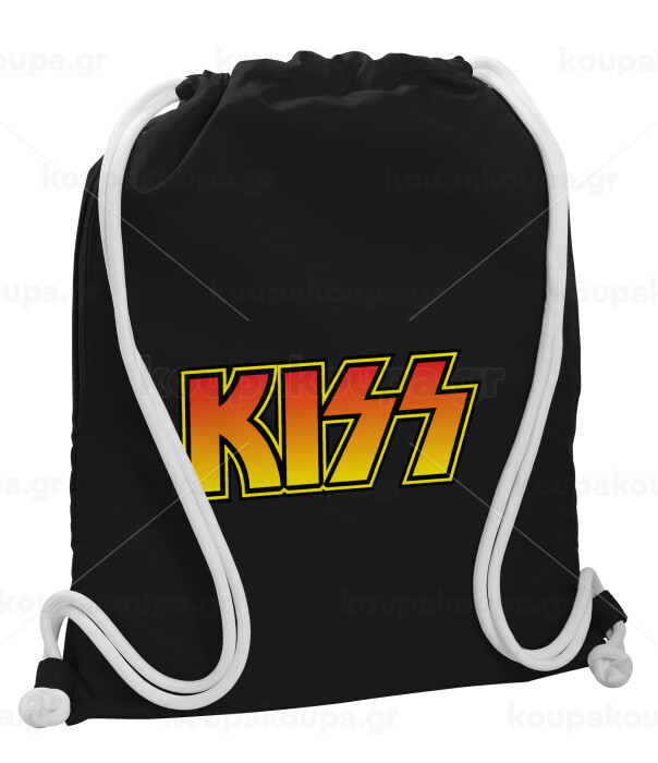 KISS, Τσάντα πλάτης πουγκί GYMBAG Μαύρη, με τσέπη (40x48cm) & χονδρά λευκά κορδόνια