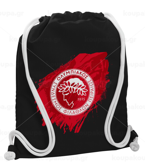 Olympiacos F.C., Τσάντα πλάτης πουγκί GYMBAG Μαύρη, με τσέπη (40x48cm) & χονδρά λευκά κορδόνια