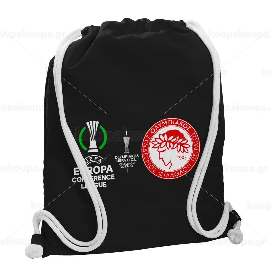 Ολυμπιακός νικητής UEFA Europa Conference League Champion 2023/24, Τσάντα πλάτης πουγκί GYMBAG Μαύρη, με τσέπη (40x48cm) & χονδρά λευκά κορδόνια