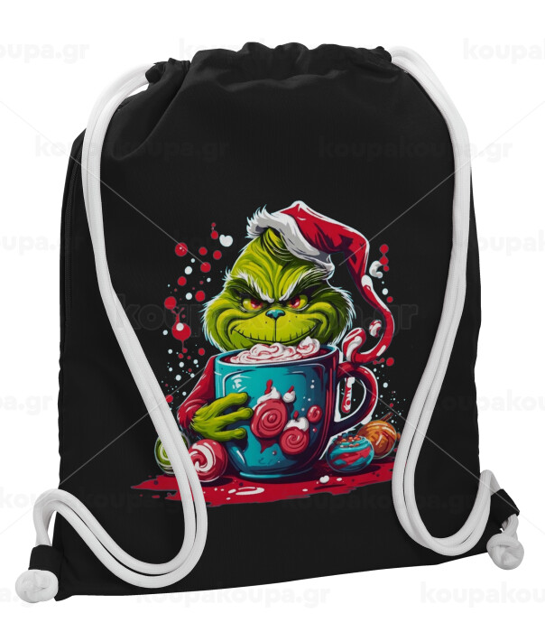 Giggling Grinchy Galore, Τσάντα πλάτης πουγκί GYMBAG Μαύρη, με τσέπη (40x48cm) & χονδρά λευκά κορδόνια