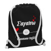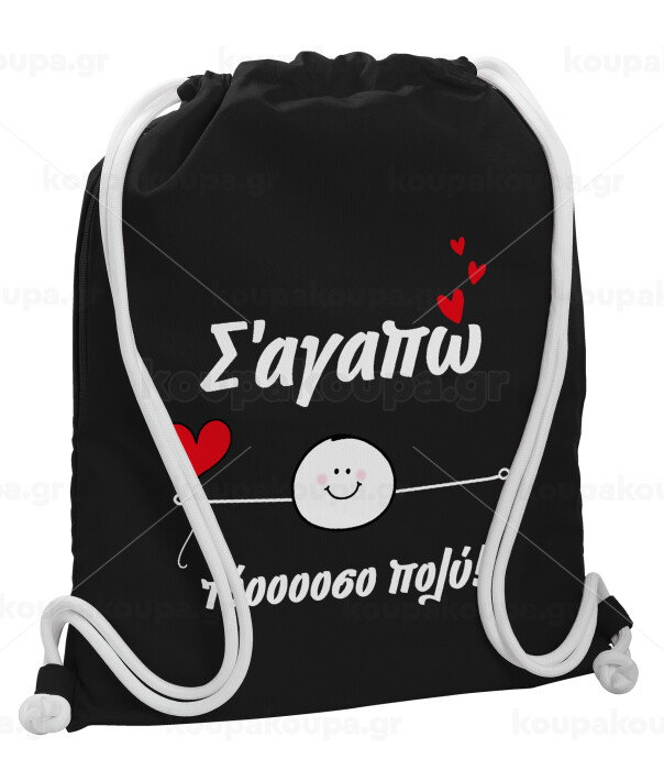 Σ΄αγαπώ τόοοοσο πολύ (Αγόρι)!!!, Τσάντα πλάτης πουγκί GYMBAG Μαύρη, με τσέπη (40x48cm) & χονδρά λευκά κορδόνια