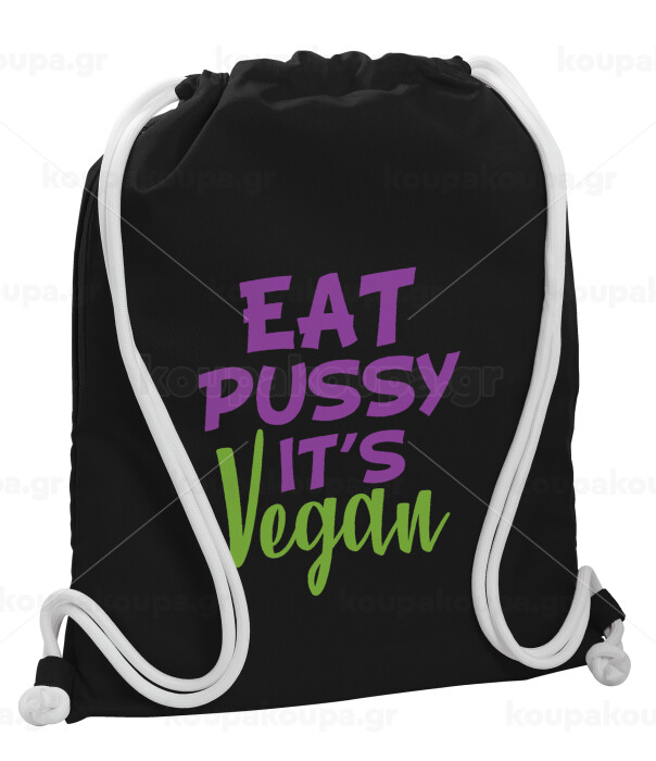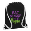 EAT pussy it's vegan, Τσάντα πλάτης πουγκί GYMBAG Μαύρη, με τσέπη (40x48cm) & χονδρά λευκά κορδόνια