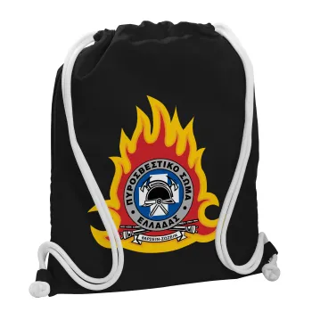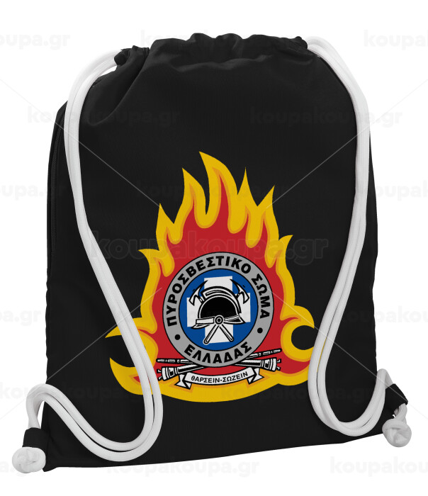Πυροσβεστικό σώμα Ελλάδος σκούρο, Τσάντα πλάτης πουγκί GYMBAG Μαύρη, με τσέπη (40x48cm) & χονδρά λευκά κορδόνια