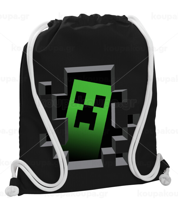 Minecraft creeper, Τσάντα πλάτης πουγκί GYMBAG Μαύρη, με τσέπη (40x48cm) & χονδρά λευκά κορδόνια
