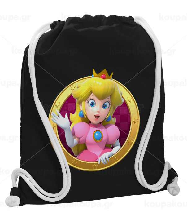 Princess Peach Toadstool, Τσάντα πλάτης πουγκί GYMBAG Μαύρη, με τσέπη (40x48cm) & χονδρά λευκά κορδόνια