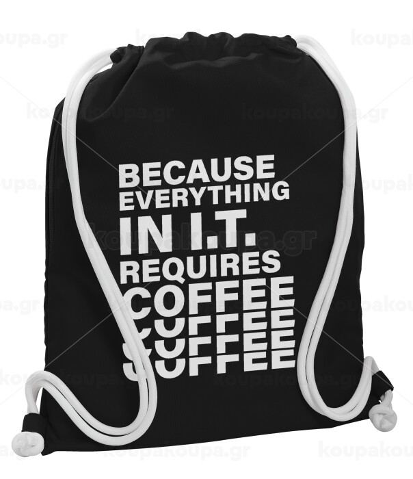 Because everything in I.T. requires coffee, Τσάντα πλάτης πουγκί GYMBAG Μαύρη, με τσέπη (40x48cm) & χονδρά λευκά κορδόνια