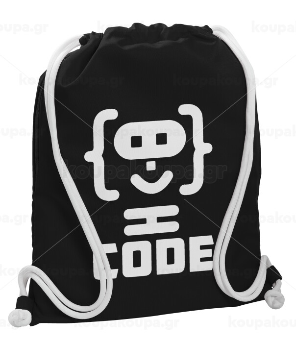 Code Heroes symbol, Τσάντα πλάτης πουγκί GYMBAG Μαύρη, με τσέπη (40x48cm) & χονδρά λευκά κορδόνια