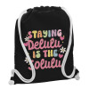 Delulu, Τσάντα πλάτης πουγκί GYMBAG Μαύρη, με τσέπη (40x48cm) & χονδρά λευκά κορδόνια