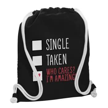 Single, Taken, Who cares i'm amazing, Τσάντα πλάτης πουγκί GYMBAG Μαύρη, με τσέπη (40x48cm) & χονδρά λευκά κορδόνια