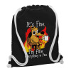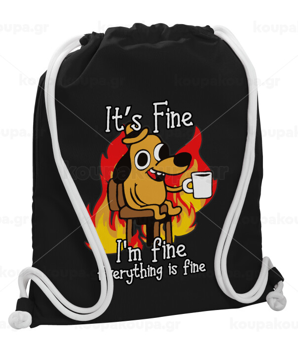 It's Fine I'm Fine Everything Is Fine, Τσάντα πλάτης πουγκί GYMBAG Μαύρη, με τσέπη (40x48cm) & χονδρά λευκά κορδόνια