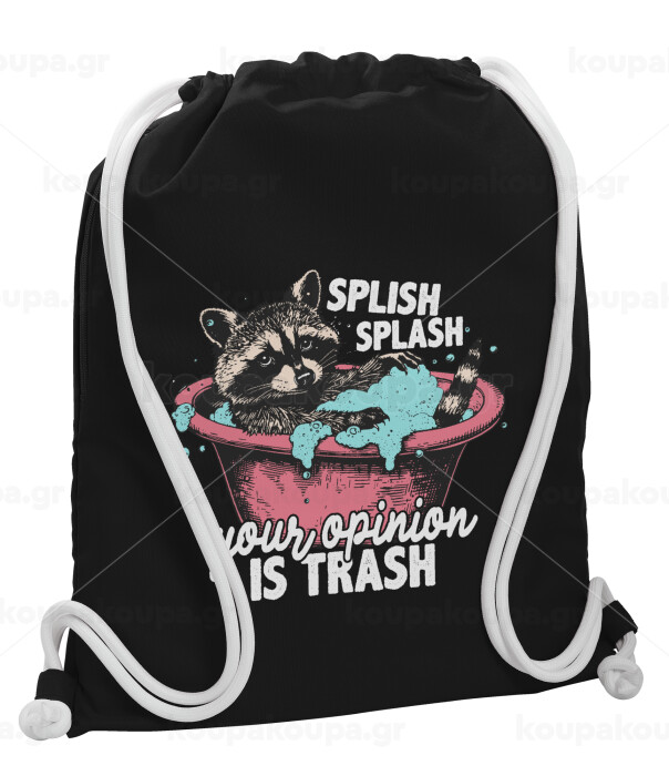 Splish splash your opinion is trash, Τσάντα πλάτης πουγκί GYMBAG Μαύρη, με τσέπη (40x48cm) & χονδρά λευκά κορδόνια