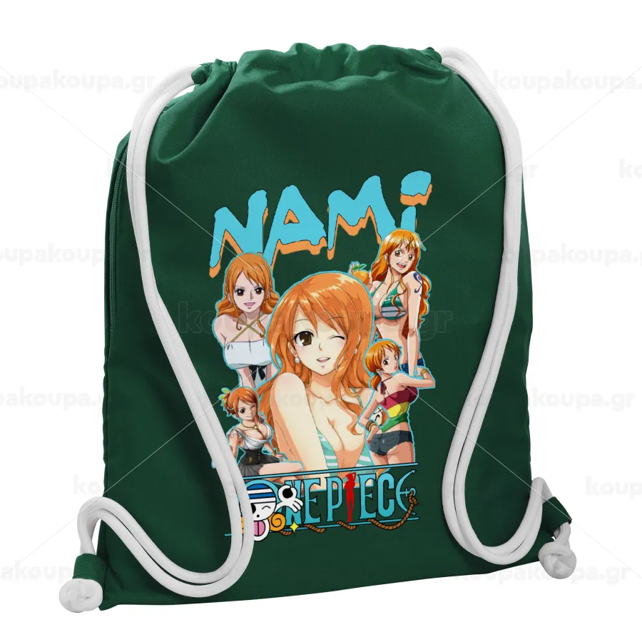 Nami One Piece, Τσάντα πλάτης πουγκί GYMBAG BOTTLE GREEN, με τσέπη (40x48cm) & χονδρά λευκά κορδόνια