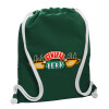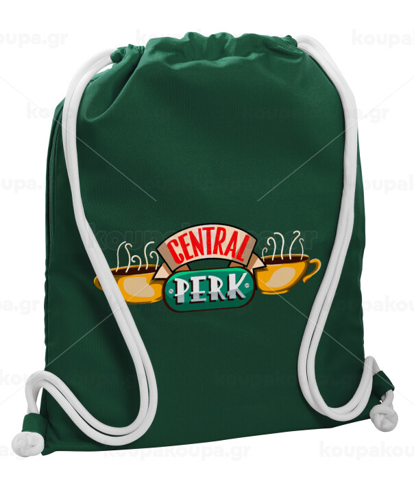 Central perk, Τσάντα πλάτης πουγκί GYMBAG BOTTLE GREEN, με τσέπη (40x48cm) & χονδρά λευκά κορδόνια