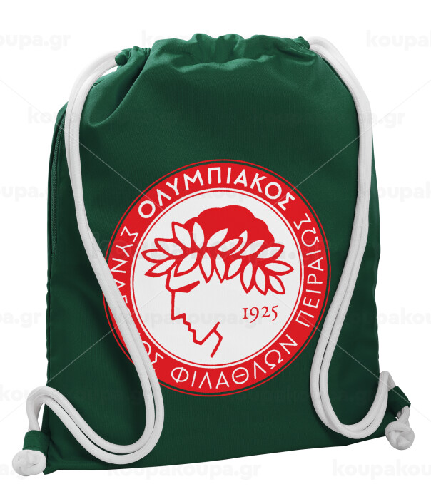 Ολυμπιακός, Τσάντα πλάτης πουγκί GYMBAG BOTTLE GREEN, με τσέπη (40x48cm) & χονδρά λευκά κορδόνια