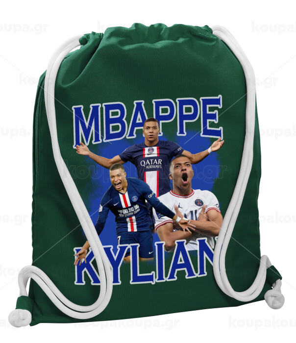 Kylian mbappe, Τσάντα πλάτης πουγκί GYMBAG BOTTLE GREEN, με τσέπη (40x48cm) & χονδρά λευκά κορδόνια