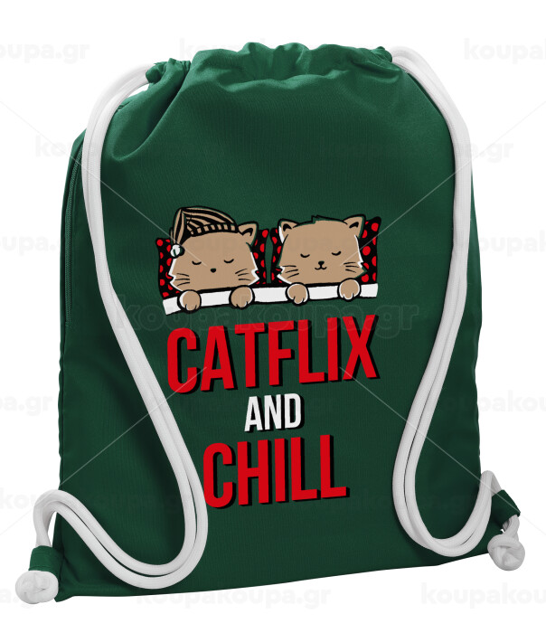 Catflix and Chill, Τσάντα πλάτης πουγκί GYMBAG BOTTLE GREEN, με τσέπη (40x48cm) & χονδρά λευκά κορδόνια