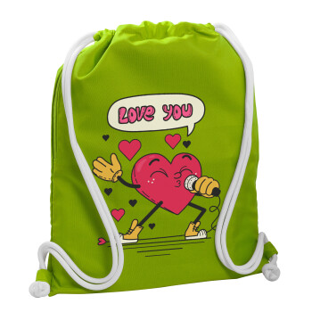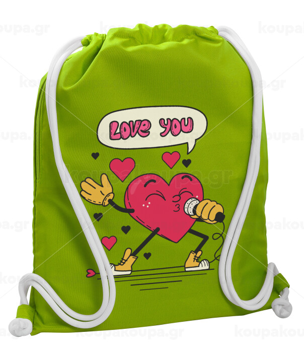 LOVE YOU SINGER!!!, Τσάντα πλάτης πουγκί GYMBAG LIME GREEN, με τσέπη (40x48cm) & χονδρά κορδόνια