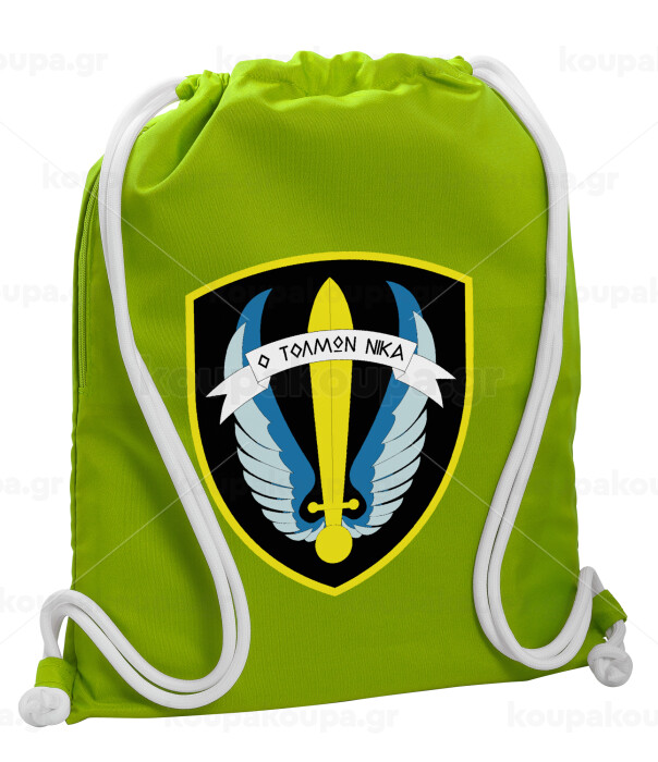 Έμβλημα Μονάδων Καταδρομών Ο Τολμων Νικα - Λοκ, Τσάντα πλάτης πουγκί GYMBAG LIME GREEN, με τσέπη (40x48cm) & χονδρά κορδόνια