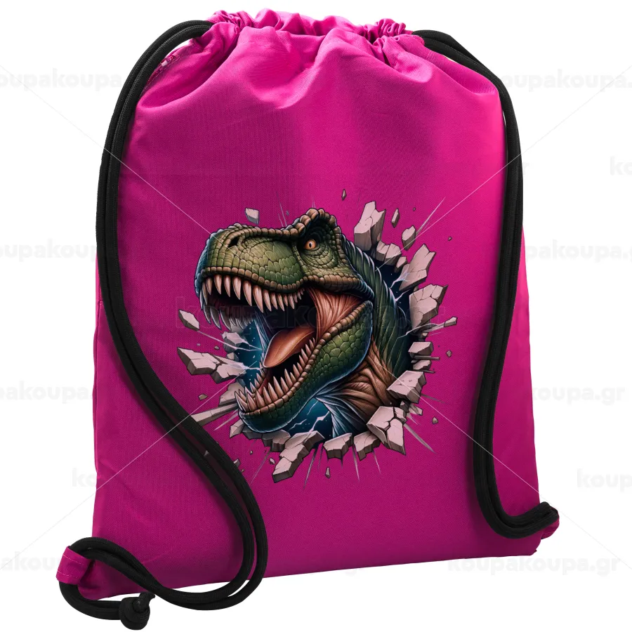 Dinosaur break wall, Τσάντα πλάτης πουγκί GYMBAG Φούξια, με τσέπη (40x48cm) & χονδρά κορδόνια