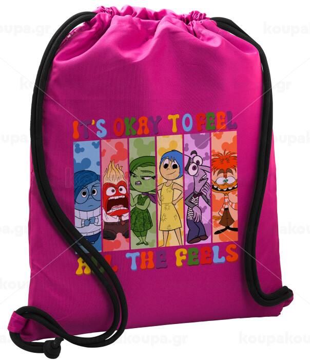 Inside Out It's Okay To Feel All The Feels , Τσάντα πλάτης πουγκί GYMBAG Φούξια, με τσέπη (40x48cm) & χονδρά κορδόνια