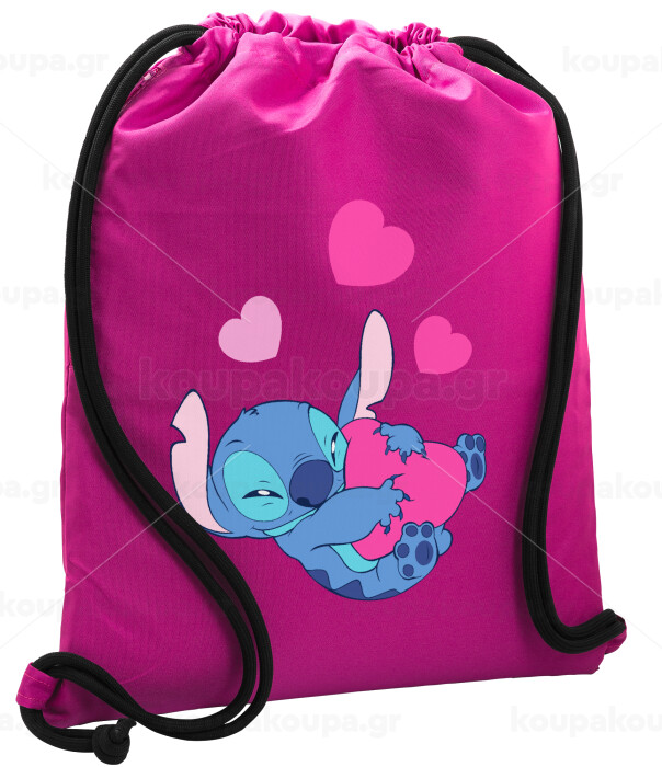 Lilo & Stitch hugs and hearts, Τσάντα πλάτης πουγκί GYMBAG Φούξια, με τσέπη (40x48cm) & χονδρά κορδόνια