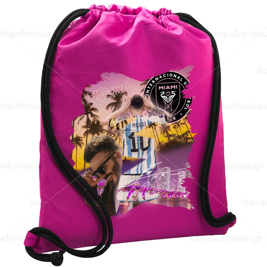 Lionel Messi Miami, Τσάντα πλάτης πουγκί GYMBAG Φούξια, με τσέπη (40x48cm) & χονδρά κορδόνια