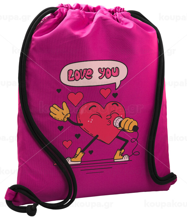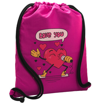 LOVE YOU SINGER!!!, Τσάντα πλάτης πουγκί GYMBAG Φούξια, με τσέπη (40x48cm) & χονδρά κορδόνια
