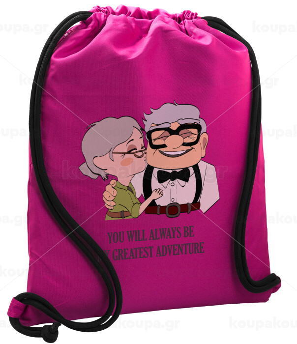 UP, YOU WILL ALWAYS BE MY GREATEST ADVENTURE, Τσάντα πλάτης πουγκί GYMBAG Φούξια, με τσέπη (40x48cm) & χονδρά κορδόνια