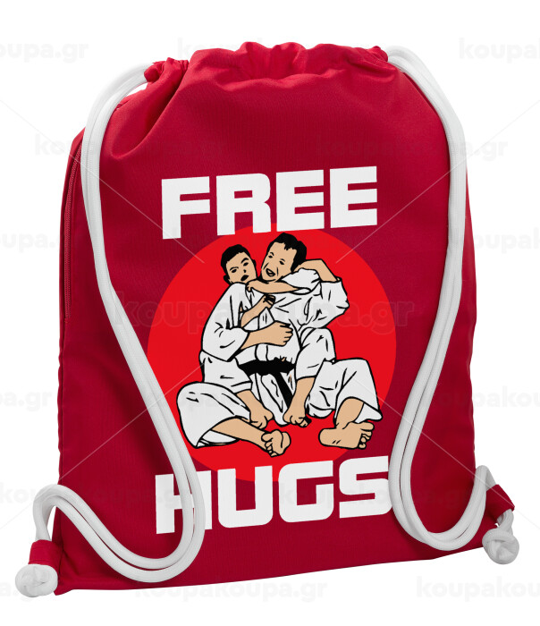 JUDO free hugs, Τσάντα πλάτης πουγκί GYMBAG Κόκκινη, με τσέπη (40x48cm) & χονδρά κορδόνια