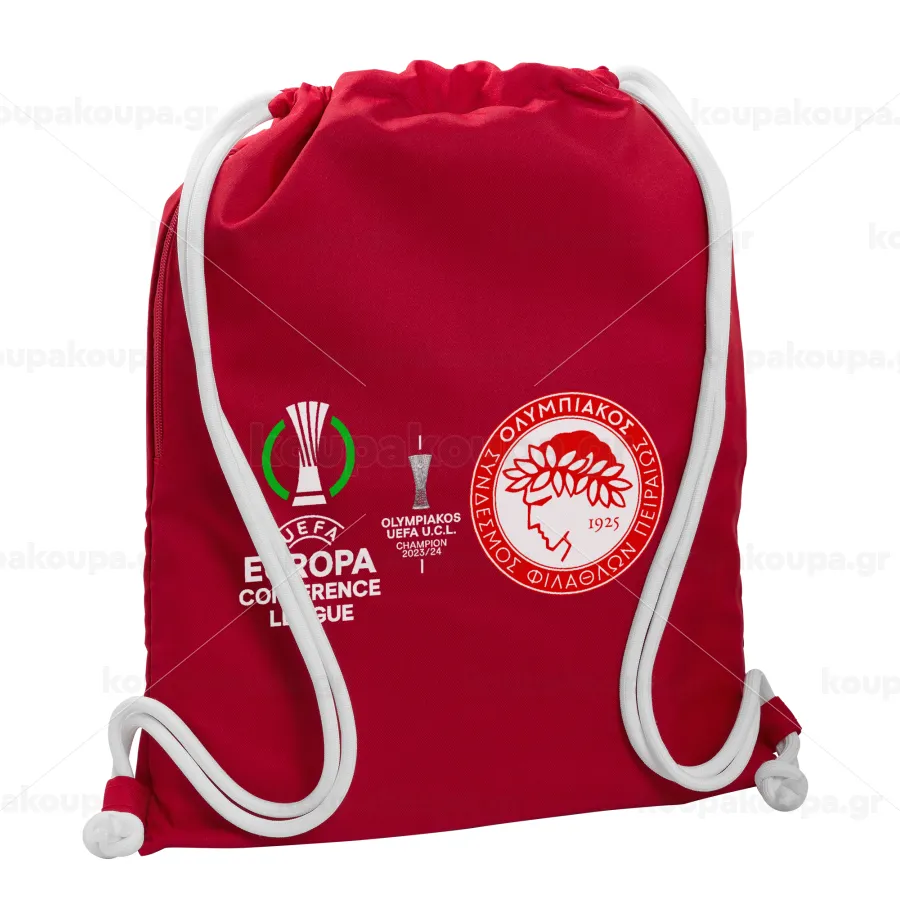 Ολυμπιακός νικητής UEFA Europa Conference League Champion 2023/24, Τσάντα πλάτης πουγκί GYMBAG Κόκκινη, με τσέπη (40x48cm) & χονδρά κορδόνια