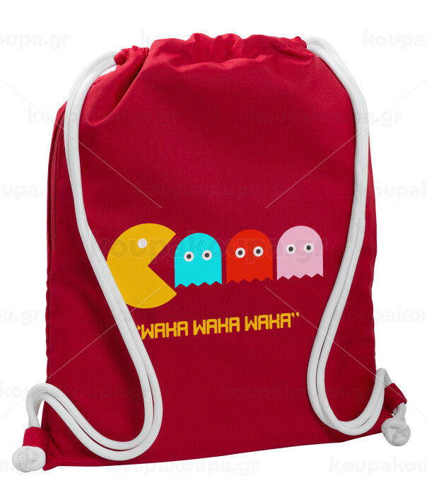 Pacman waka waka waka, Τσάντα πλάτης πουγκί GYMBAG Κόκκινη, με τσέπη (40x48cm) & χονδρά κορδόνια