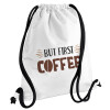 But first Coffee, Τσάντα πλάτης πουγκί GYMBAG λευκή, με τσέπη (40x48cm) & χονδρά κορδόνια